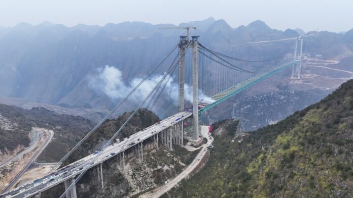 El 21 de agosto, el puente más alto en construcción del mundo —el Puente del Cañón Huajiang en la provincia de Guizhou, China— inició oficialmente sus pruebas de carga. La obra, cuya construcción comenzó en 2022, se extiende sobre el Gran Cañón de Huajiang, conocido como la “grieta de la Tierra”, y constituye el proyecto de control principal de la autopista Liuzhi–Anlong en Guizhou. Se trata de un puente colgante con estructura de vigas de acero en celosía, con una longitud total de 2.890 metros, un vano principal de 1.420 metros y una altura de 625 metros desde la calzada hasta la superficie del agua